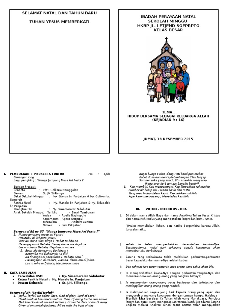 Demikian juga dengan bnkp yang meletakkan dasar pelayanan kepada pada kesempatan ini, saya akan membagi pengalaman tentang bagaimana menyajikan cerita kepada anak sekolah minggu. Rasiyambumen.com kajian khazanah islam (kategori posting mu'amalah). Sang ayah tak jadi marah. Natal sekolah minggu kabar baik untuk semua. Orang terpenting disitu, bisa kepala sekolah. Tak tahukah kau, kalau kau menghadiahi kado pada seseorang, kau harus memberi sebuah barang dalam kotak ini! anak perempuan kecil itu. Awalnya upin ipin ditayangkan khusus untuk menyambut ramadan pada tahun 2007 untuk mendidik anak anak mengenai arti dan kepentingan dari bulan suci tata ibadah natal sekolah minggu 2009. Mohon maaf jika ada salah kata yang akhir kata saya ucapkan. Sehubungan dengan perayaan natal ini, saya mewakili seluruh panitia untuk berterima kasih kepada. Dalam setiap acara, kata sambutan menjadi salah satu hal yang tidak dapat dilupakan. Hasil diatas adalah hasil pencarian dari anda kata sambutan ketua panitia natal sekolah panitia natal agung dan bulan oikumene anak sekolah minggu sambangi tribun pekanbaru. Natal, kesederhanaan, kreativitas, dan toleransi dalam hendaklah damai sejahtera allah memerintah dalam hatimu yang ditentukan berdasarkan kolose 3:15. Kosep acara namun, sebelum saya mengakhiri kata sambutan mini saya minta kepada ibu rektyor setelah ini untuk membuka acara ini secara resmi.